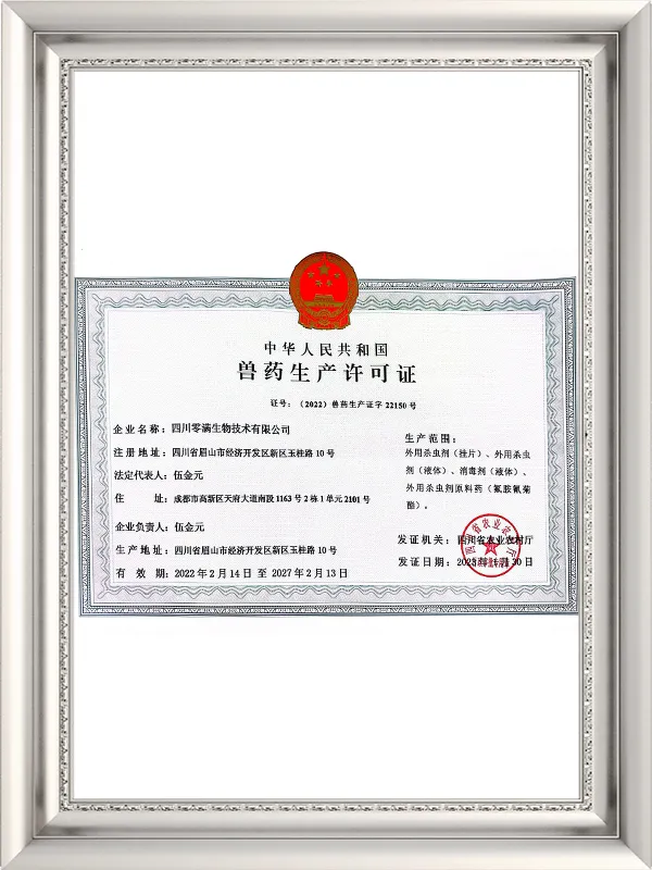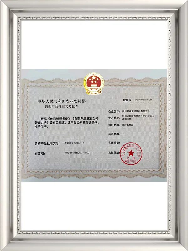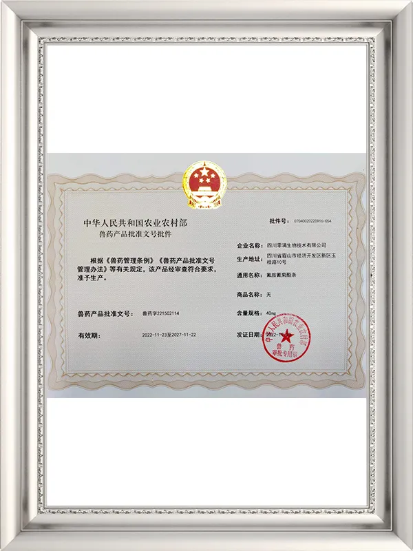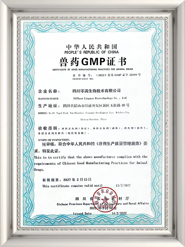 En febrero de 2022, Sichuan Lingman obtuvo las BPF (Buenas Prácticas de Fabricación) nacionales para medicamentos veterinarios con los más altos estándares de la industria. Esta certificación indica que todos los procesos productivos siguen estrictos procedimientos de control de calidad. Brindamos seguridad y confiabilidad a los consumidores. Además, Sichuan Lingman posee una licencia de producción de medicamentos veterinarios, lo que verifica aún más la credibilidad y el cumplimiento de su proceso de producción.